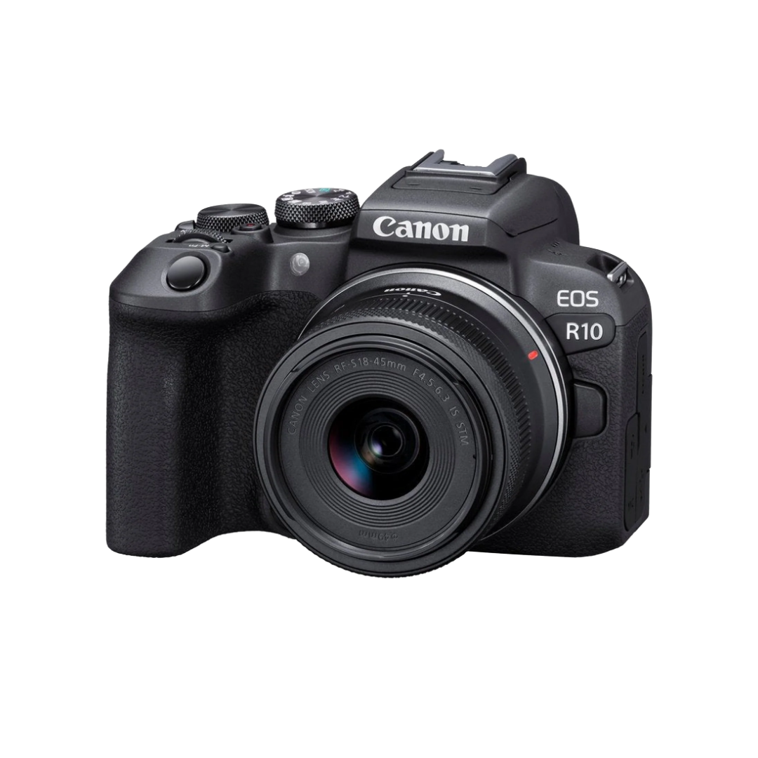 An entry-to-mid-level APS-C mirrorless camera kit combining the powerful Canon EOS R10 body with a versatile RF-S 18–45mm f/4.5–6.3 IS STM lens — perfect for beginners and enthusiast shooters who want high-quality stills and 4K video in a compact, easy-to-use package